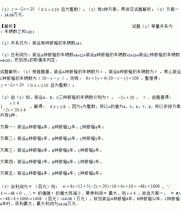 我市某镇组织20辆汽车装运完A、B、C三种脐橙共100吨到外地销售.按计划,20辆汽车都要装运,每辆汽车只能装运同一种脐橙,且必须装满.根据下表提供的信息,解答以下问题: