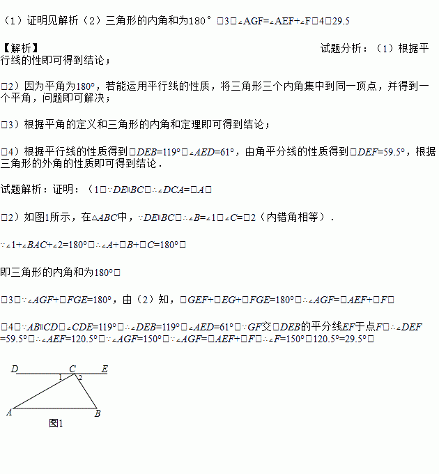 (2)如图1,求证:三角形ABC的三个内角(即∠A、∠B、∠ACB)之和等于180°;
