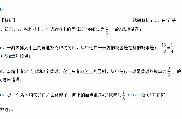 A. 在“石头、剪刀、布”的游戏中,小明随机出的是“剪刀”