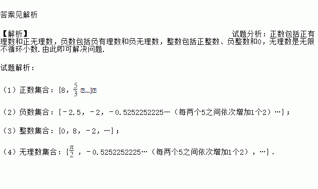 答案见解析 【解析】试题分析:正数包括正有理数和正无理数,负数包括负有理数和负无理数,整数包括正整数、负整数和0,无理数是无限不循环小数.由此即可解决问题. 试题解析: (1)正数集合:{8,,…}; (2)负数集合:{﹣2.5,﹣2,﹣0.5252252225…(每两个5之间依次增加1个2)…}; (3)整数集合:{0,8,﹣2,…}; (4)无理数集合:{,...