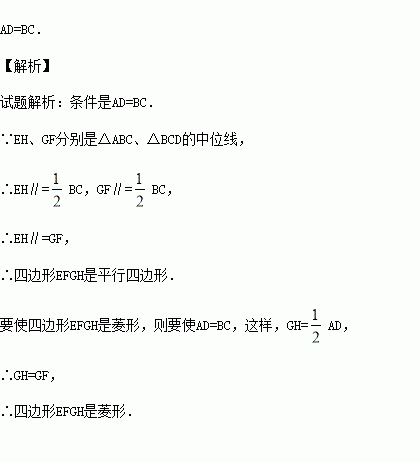 如图,在四边形ABCD中,E、F、G、H分别是AB、BD、CD、AC的中点,要使四边形EFGH是菱形,则四边形ABCD需满足的一个条件是 .