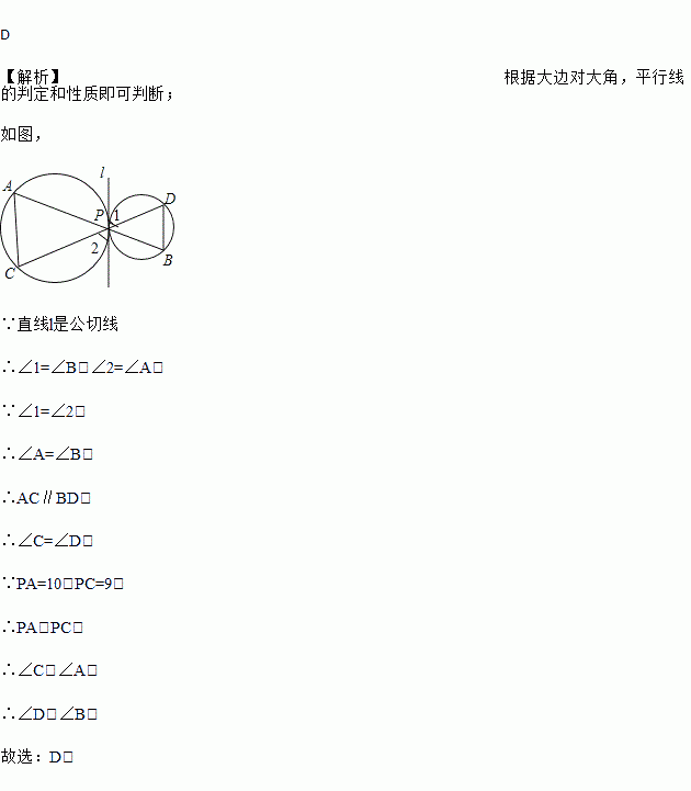 如图,两圆外切于P点,且通过P点的公切线为L,过P点作两直线,两直线与两圆的交点为A、B、C、D,其位置如图所示,若AP=10,CP=9,则下列角度关系何者正确?( )