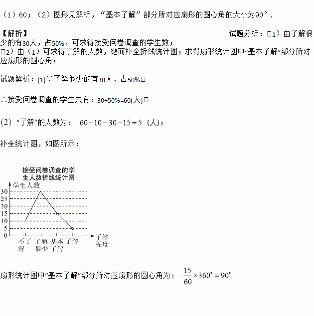 (2)请补全折线统计图,并求出扇形统计图中“基本了解”部分所对应扇形的圆心角的大小.