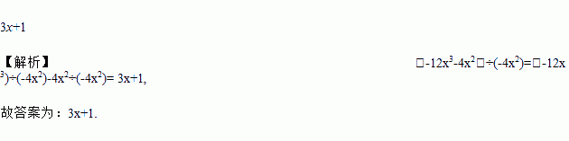 3x+1 【解析】(-12x3-4x2)÷(-4x2)=(-12x3)÷(-4x2)-4x2÷(-4x2)= 3x+1, 故答案为:3x+1.