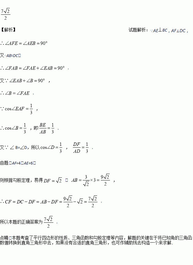 如图,平行四边形ABCD中,AE⊥BC于E,AF⊥CD于F,若AE=6,AF=4,cos∠EAF=