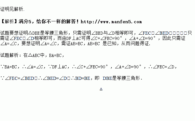 如图,△ABC中,BA=BC,点D是AB延长线上一点,DF⊥AC于F交BC于E.求证:△DBE是等腰三角形.