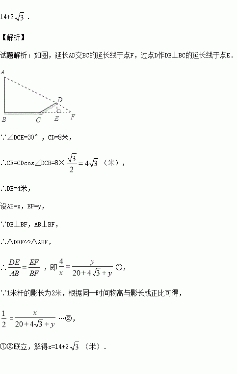 如图,小阳发现电线杆AB的影子落在土坡的坡面CD和地面BC上,量得CD=8米,BC=20米,CD与地面成30°角,且此时测得1米杆的影长为2米,则电线杆的高度为 米.
