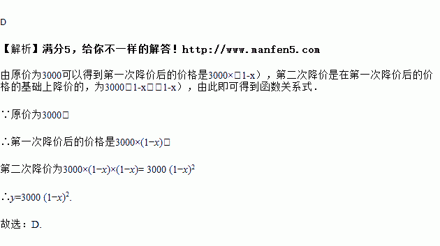 某手机店为减少库存,对原价为3000元的某款智能手机连续进行两次降价.若设平均每次降价的百分率是x,降价后的价格为y元,则y与x之间的函数关系式为( )
