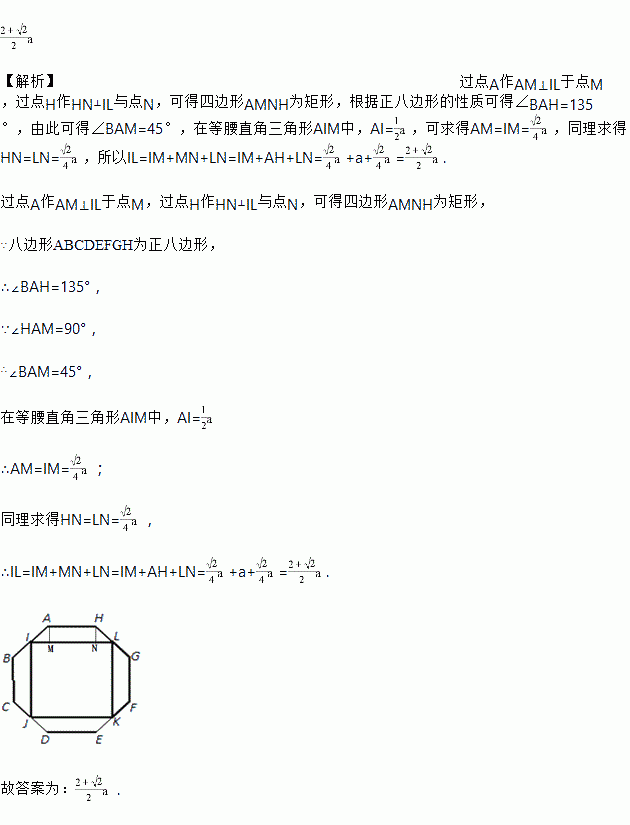 如图,正八边形ABCDEFGH的边长为a,I、J、K、L分别是各自所在边的中点,且四边形IJKL是正方形,则正方形IJKL的边长为________(用含a的代数式表示).