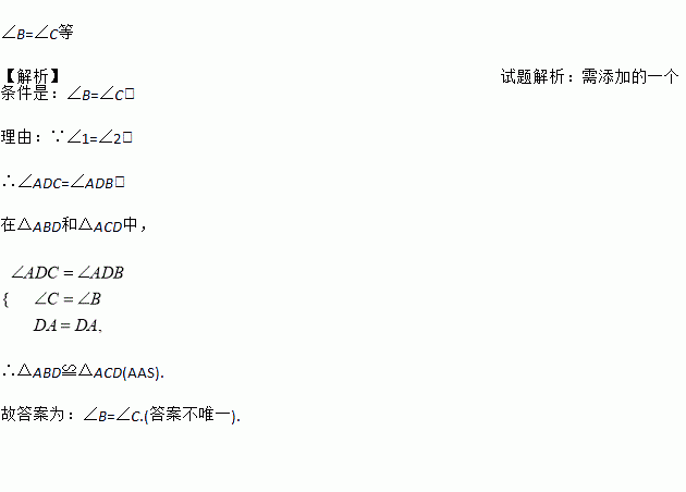 如图,∠1=∠2,要使△ABD≌△ACD,需添加的一个条件是_________