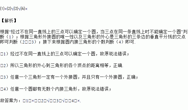 (3)任意一个三角形一定有一个外接圆,并且只有一个外接圆(_____)