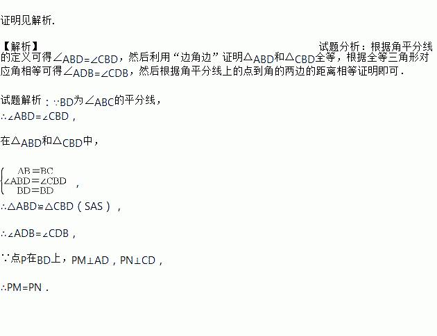 已知,如图,BD是∠ABC的平分线,AB=BC,点P在BD上,PM⊥AD,PN⊥CD,垂足分别是M、N.试说明:PM=PN.