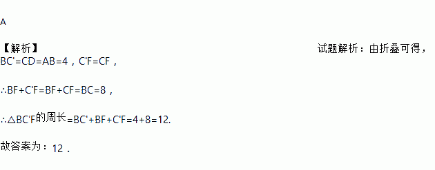 A 【解析】试题解析:由折叠可得,BC'=CD=AB=4,C'F=CF, ∴BF+C'F=BF+CF=BC=8, ∴△BC′F的周长=BC'+BF+C'F=4+8=12. 故答案为:12.