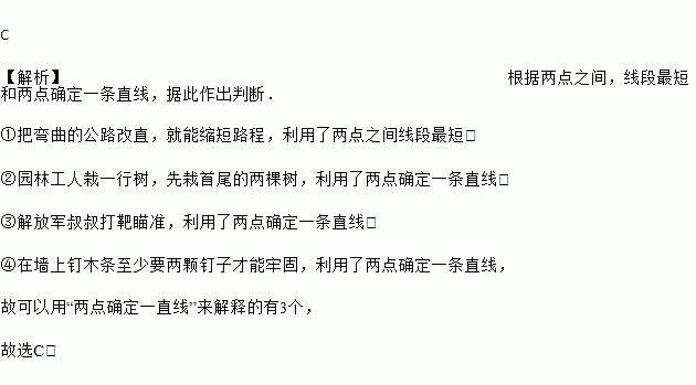 ①把弯曲的公路改直,就能缩短路程;②园林工人栽一行树,先栽首尾的两棵树;③解放军叔叔打靶瞄准;④在墙上钉木条至少要两颗钉子才能牢固.