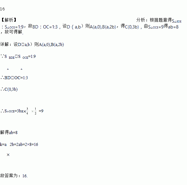 如图,四边形OABC中,AB∥OC,边OA在x轴的正半轴上,OC在y轴的正半轴上,点B在第一象限内,点D为AB的中点,CD与OB相交于点E,若△BDE、△OCE的面积分别为1和9,反比例函数y=