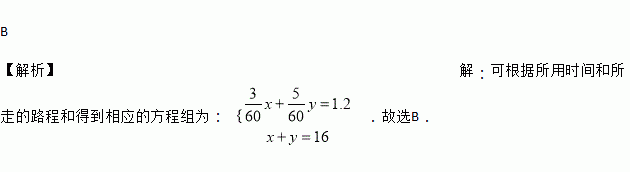 小颖家到学校1200米,其中有一段为上坡路,另一段为下坡路,她去学校共用了16分钟。假设小颖上坡路的平均速度是3千米/时,下坡路的平均速度是5千米/时,若设小颖上坡用了x分钟,下坡用了y分钟。则可列方程组为( )
