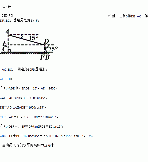 如图,某翼装飞行员从离水平地面高AC=500m的A处出发,沿着俯角为15°的方向,直线滑行1600米到达D点,然后打开降落伞以75°的俯角降落到地面上的B点.求他飞行的水平距离BC(结果精确到1m).