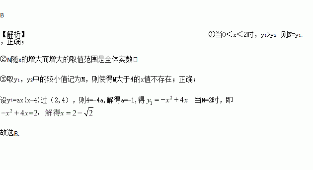 在平面直角坐标系中,已知抛物线与直线的图象如图所示,当y1≠y2时,取y1,y2中的较大值记为N;当y1=y2时,N=y1=y2.则下列说法:①当0<x<2时,N=y1;②N随x的增大而增大的取值范围是x<0;③取y1,y2中的较小值记为M,则使得M大于4的x值不存在;④若N=2,则x=2﹣