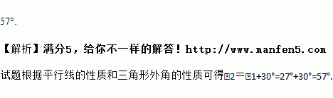 如图,将一块含有30°角的直角三角板的两个顶点叠放在矩形的两条对边上,如果∠1=27°,那么∠2=________°.