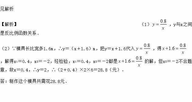 某工作人员打算利用不锈钢条制作一个面积为0.8m2的矩形模具.设矩形模具的长为ym,宽为xm.