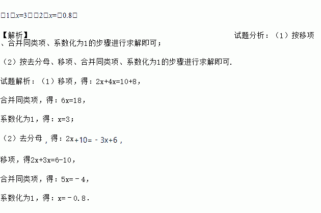 (1)2x﹣8=10﹣4x; (2)x+5=﹣x+3.