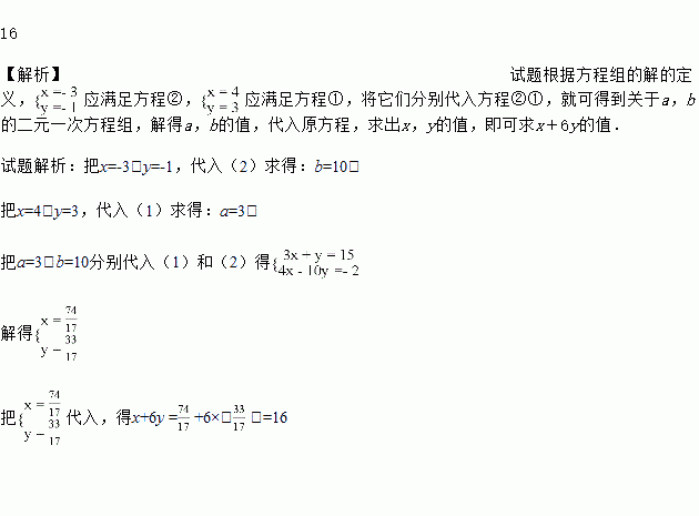 已知方程组甲由于看错了方程(1)中的a,得到方程组的解为,乙由于看错了方程(2)中的b,得到方程组的解为,若按正确的计算,求x+6y的值.