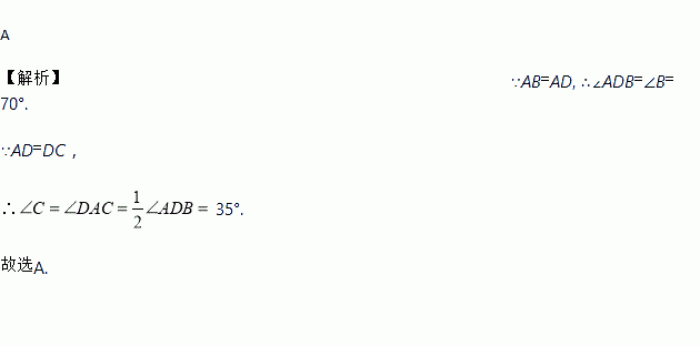 在△ABC中,D是BC上的点,AB=AD=DC,∠B=70°,则∠C的度数为( )