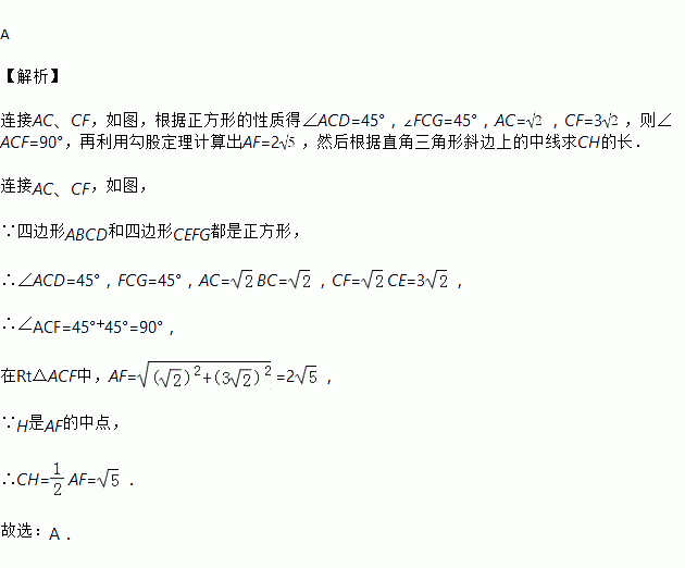 如图,正方形ABCD和正方形CEFG中,点D在CG上,BC=1,CE=3,H是AF的中点,那么CH的长是( )