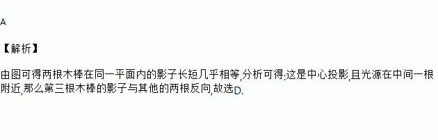 某时刻两根木棒在同一平面内的影子如图所示,此时,第三根木棒的影子表示正确的是( )