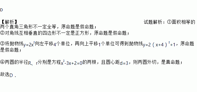 D 【解析】试题解析:①面积相等的两个直角三角形不一定全等,原命题是假命题; ②对角线互相垂直的四边形不一定是正方形,原命题是假命题; ③将抛物线y=2x2向左平移4个单位,再向上平移1个单位可得到抛物线y=2(x+4)2+1,原命题是假命题; ④两圆的半径R、r分别是方程x2-3x+2=0的两根,且圆心距d=3,则两圆外切,是真命题; 故选D.
