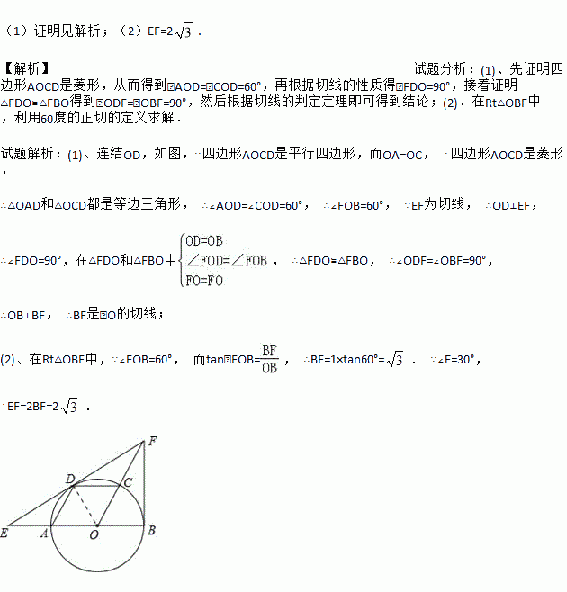 (1)证明见解析;(2)EF=2. 【解析】试题分析:(1)、先证明四边形AOCD是菱形,从而得到∠AOD=∠COD=60°,再根据切线的性质得∠FDO=90°,接着证明△FDO≌△FBO得到∠ODF=∠OBF=90°,然后根据切线的判定定理即可得到结论;(2)、在Rt△OBF中,利用60度的正切的定义求解. 试题解析:(1)、连结OD,如图,∵四边形AOCD是平行四边形,而OA=OC...