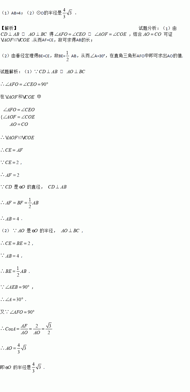 如图,CD为⊙O的直径,CD⊥AB,垂足为点F,AO⊥BC,垂足为点E,CE=2.