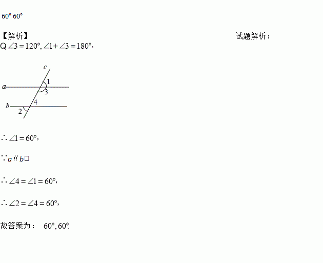 如图,已知a∥b,若∠3=120°,则∠1=________;∠2=________.