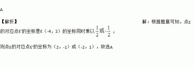 如图,E(-4,2),F(-1,-1),以O为位似中心,按比例尺1:2,把△EOF缩小,则点E的对应点E′的坐标为( ).
