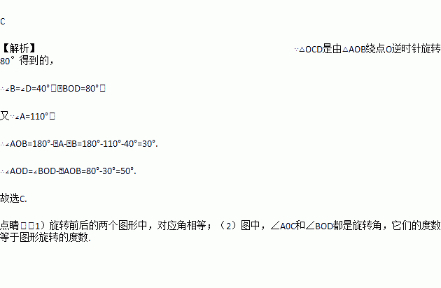 如图, 绕点O逆时针旋转得到,若∠A=,∠D=,则∠AOD的度数是( )
