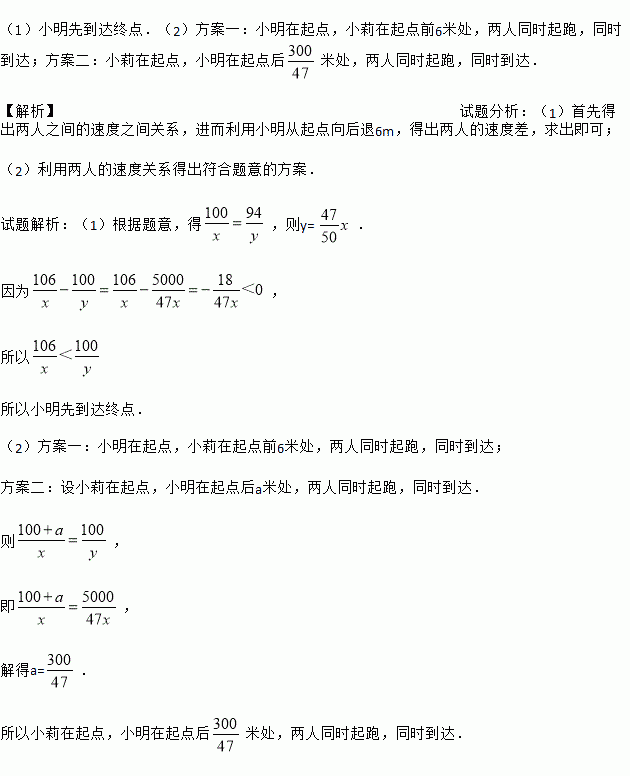 (2)如果两人想同时到达终点,应如何安排两人起跑位置?请设计两种方案.