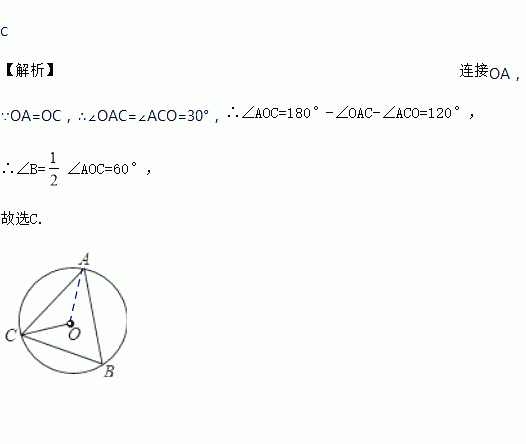 如图,⊙O是△ABC的外接圆,已知∠ACO=30°,则∠B的度数是( )