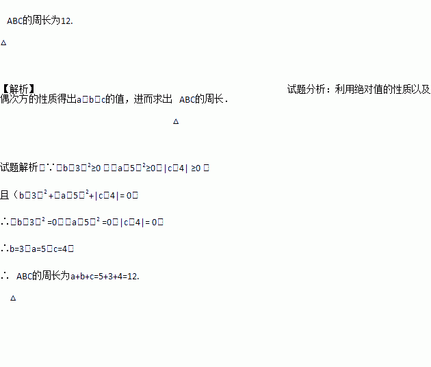如果a、b、c是△ABC的三边,满足(b-3)2 +(a-5)2+│c-4│= 0,求△ABC的周长.