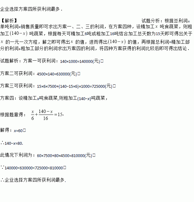 安宁市的一种绿色蔬菜,若在市场上直接销售,每吨利润为1000元,若经粗加工后销售,每吨利润可达4500元;若经精加工后销售每吨获利7500元.当地一家农产品企业收购这种蔬菜140吨,该企业加工厂的生产能力是:如果对蔬菜进行粗加工,每天可以加工16吨,如果进行精加工,每天可加工6吨,但两种加工方式不能同时进行,受季节条件限制,企业必须在15天的时间将这批蔬菜全部销售或加工完毕,企业研制了四种可行方案: