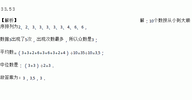 对于数据组3,3,2,3,6,3,6,3,2,4中,众数是_______.平均数是______.中位数是______.