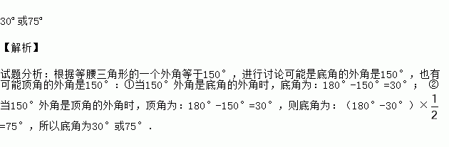 30º或75º 【解析】 试题分析:根据等腰三角形的一个外角等于150°,进行讨论可能是底角的外角是150°,也有可能顶角的外角是150°:①当150°外角是底角的外角时,底角为:180°-150°=30°; ②当150°外角是顶角的外角时,顶角为:180°-150°=30°,则底角为:(180°-30°)×=75°,所以底角为30°或75°.