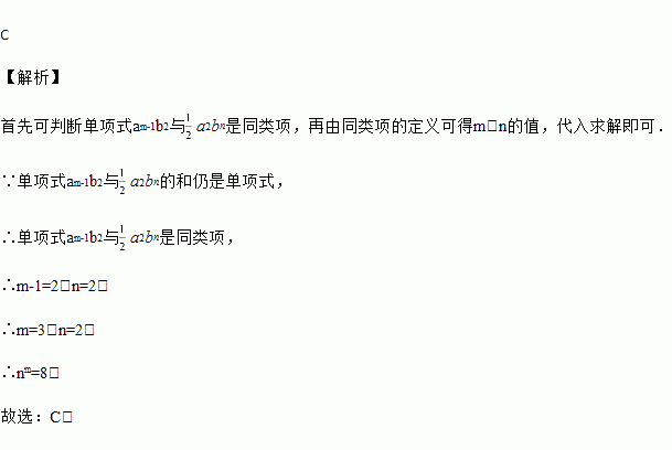 若单项式am﹣1b2与的和仍是单项式,则nm的值是( )