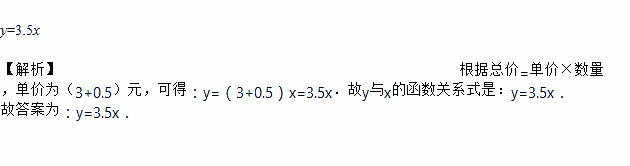 某商店进了一批货,每件3元,出售时每件加价0.5元,如售出x件应收入货款y元,那么y(元)与x(件)的函数表达式是_________________.