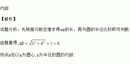 点A的坐标为(3,0),点B的坐标为(0,4),则点B在以A为圆心, 6为半径的圆的_______.
