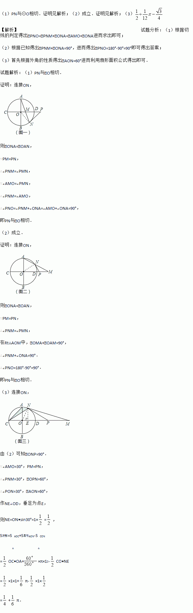 (1)当点M在⊙O内部,如图一,试判断PN与⊙O的关系,并写出证明过程;