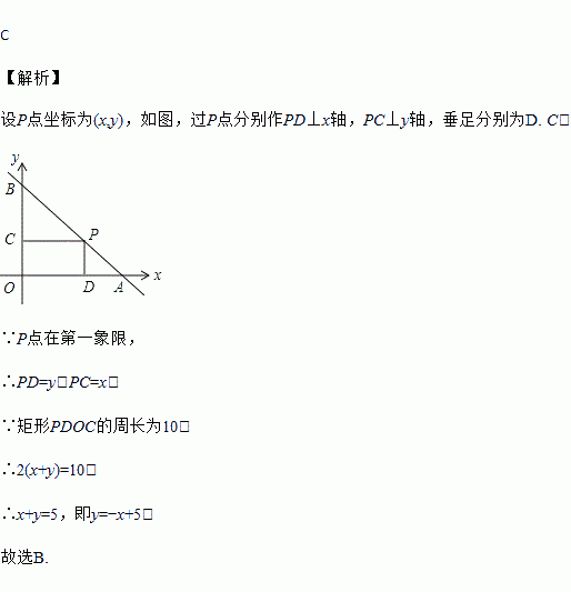 如图,一直线与两坐标轴的正半轴分别交于A,B两点,P是线段AB上任意一点(不包括端点),过点P分别作两坐标轴的垂线与两坐标轴围成的长方形的周长为10,则该直线的函数表达式是( )