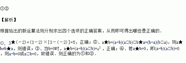 在有理数的原有运算法则中,我们补充定义一种新运算“★”如下:a★b=(a+b)(a﹣b),例如:5★3=(5+3)×(5﹣3)=8×2=16,下面给出了关于这种新运算的几个结论:① 3★(﹣2)=5;②a★b=b★a;③若b=0,则a★b=a2;④若a★b=0,则a=b.其中正确结论的有__;(只填序号)