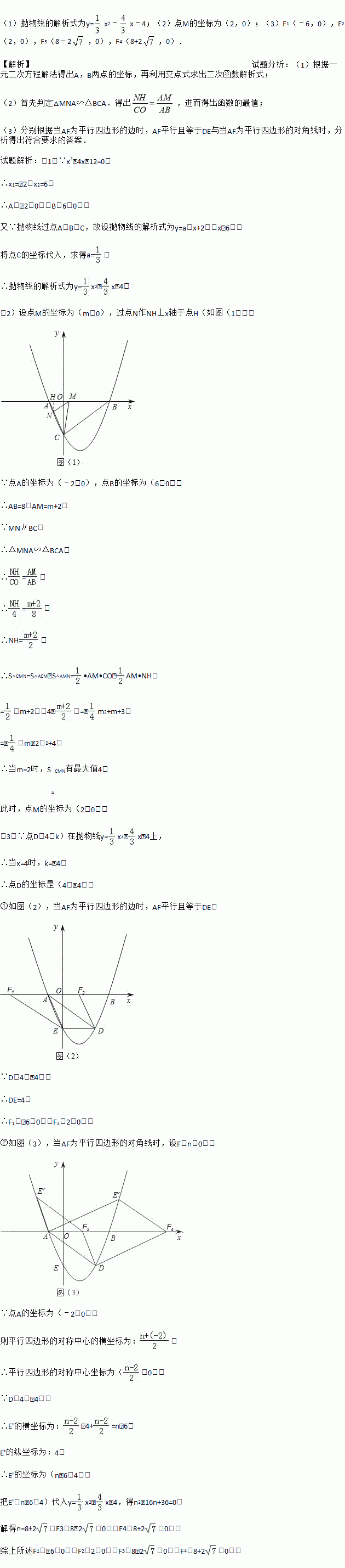 (3)点D(4,k)在(1)中抛物线上,点E为抛物线上一动点,在x轴上是否存在点F,使以A、D、E、F为顶点的四边形是平行四边形?如果存在,直接写出所有满足条件的点F的坐标;若不存在,请说明理由.