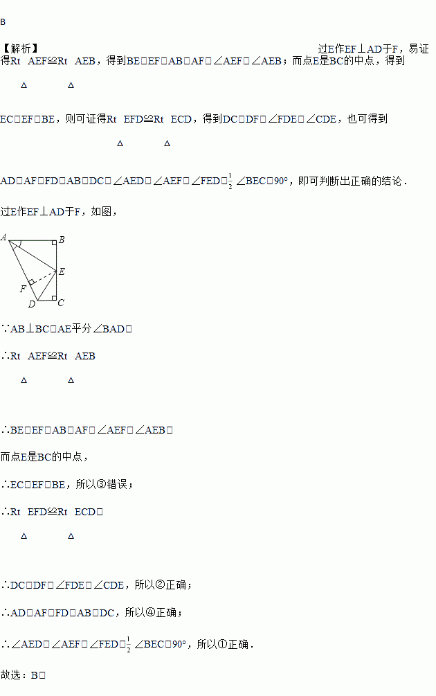 如图,AB⊥BC,DC⊥BC,AE 平分∠BAD,DE 平分∠ADC,以下结论:①∠AED=90°;②点 E 是 BC 的中点;③DE=BE;④AD=AB+CD;其中正确的是( )