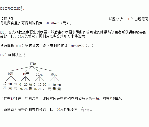 (1)70;(2). 【解析】试题分析:(1)由题意可得该顾客至多可得到购物券:50+20=70(元); (2)首先根据题意画出树状图,然后由树状图求得所有等可能的结果与该顾客所获得购物券的金额不低于50元的情况,再利用概率公式即可求得答案. 试题解析:(1)则该顾客至多可得到购物券:50+20=70(元); (2)画树状图得: ∵共有12种等可能的结果,该顾客所获得...